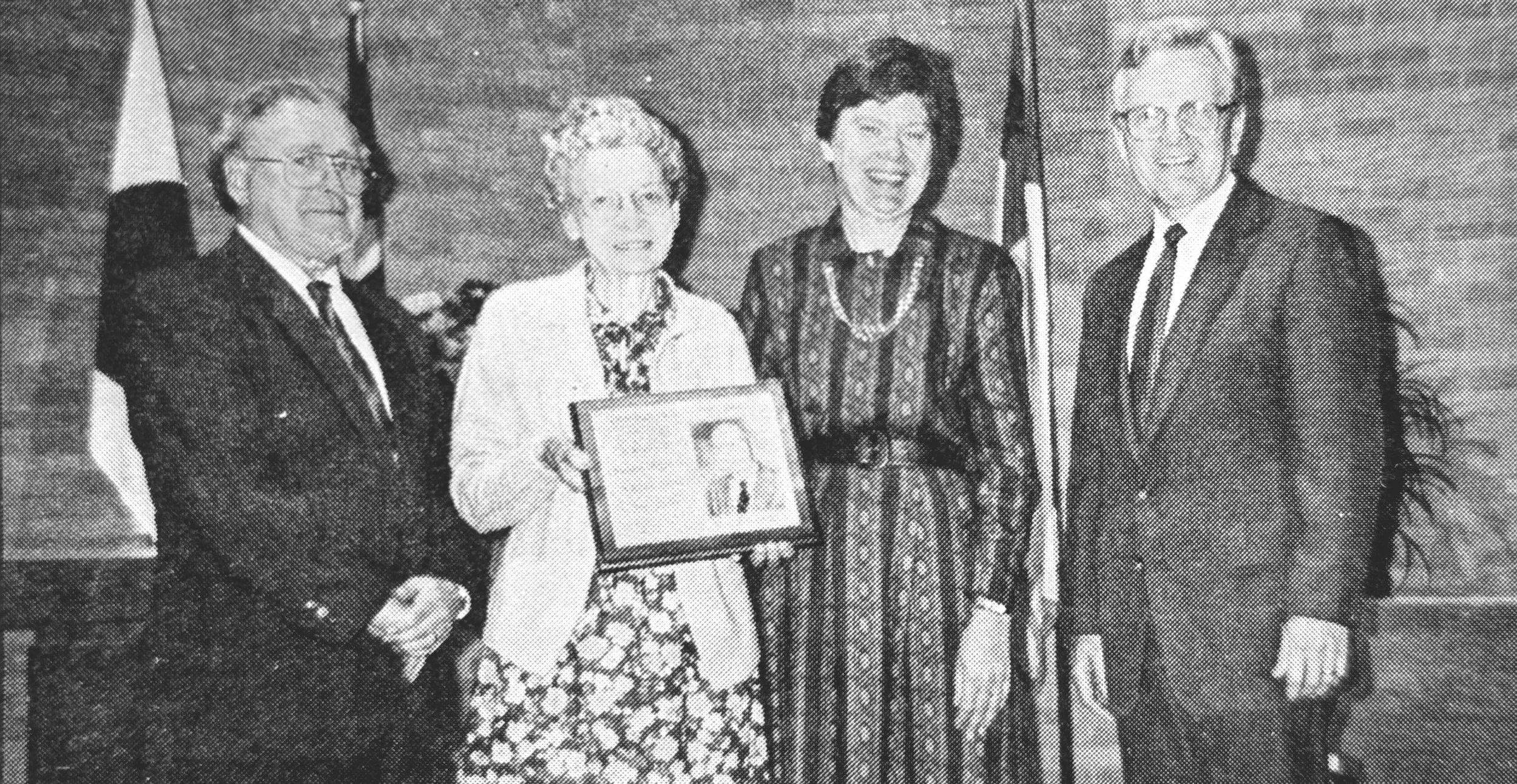 Pastors John Kilde (left) and Don Brue (right) presented a plaque to Mrs. Julia Christiansen (second from the left) and her daughter Alta Hemmingson, at the Lutheran Brethren Schools’ Homecoming Service, October 7, 1990. The plaque commemorated the recent naming of the Christiansen Memorial Library at Lutheran Brethren Seminary. Pastor Christiansen served as an instructor and librarian at Lutheran Brethren Schools for many years.